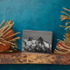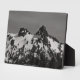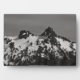 Fotografía en blanco y negro de dos picos en la cordillera de Tatoosh, conocida como El Castillo y El Pinnacle. La cordillera está cubierta de nieve a pesar de ser de verano. Hay árboles y piedras dispersas por el paisaje y las montañas. La posición del sol permite colocar sombras sobre la montaña. Las nubes incognitivas adornan el cielo. Derechos reservados ©2023 Kimberly J Tilley. zazzle.com/store/developingnature