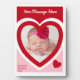 Crea el regalo perfecto para El día de San Valentín. Esta placa fotográfica tiene el aspecto de una dulce caja de caramelos con un esquema de color rojo, rosa y blanco. El marco en forma de corazón está listo para tu propia foto. Agregue su propio mensaje personalizado con letras blancas en la parte superior. Hay un punto para añadir un segundo mensaje con letras rojas en la esquina inferior.