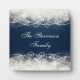 Un elegante diseño abstracto con encaje de color crema y perlas hechas con círculos y burbujas. El fondo es azul oscuro con cuadrados descoloridos hacia el lado. Bonito y delicado diseño. Personalizar / personalización con su propio nombre, apellido u otro texto. Se vería bien con una colección de fotos.