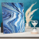 Una variedad de tonos azules y blancos juegan y nadan juntos para crear una composición vibrante. El arte fluido es notablemente tridimensional; todos los colores se mezclan para crear una pieza única de arte moderno.
