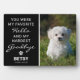 Placa conmemorativa para mascotas con un corazón que incluye una foto de tu querida mascota, y la cita de condolencias que dice "Fuiste mi saludo favorito y mi adiós más difícil", una huella de pata con un corazón dentro, el nombre de tu mascota y las fechas de sus años de vida. Un hermoso recuerdo para una familia que amaba profundamente a su perro/gato.