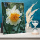 Foto de primer plano de la flor de daffodil entre hojas verdes y hierba.