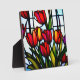 Representados en un diseño de vidrio emplomado están tulipanes rojos