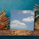 Esta impresionante placa muestra una fotografía de unas nubes de cúmulo blancas onduladas flotando tranquilamente sobre un hermoso cielo azul.