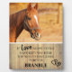 Que el recuerdo de tu hermoso caballo perdure con esta maravillosa placa conmemorativa. Con una fotografía de tu caballo sobre un fondo de madera rústica, la dulce frase 'Si el amor solo hubiera podido mantenerte aquí, habrías vivido para siempre', su nombre y dos corazones entrelazados adorables.