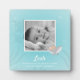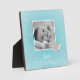 El dulce bebé de tiburón Easel Plaque tiene un fondo acuático con adorables tiburones y bebés. Añade fotos de bebés e información de nacimiento para un toque personal.