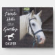 Celebra a tu mejor amigo con una placa conmemorativa de un mascota personalizado. Esta placa fotográfica es el regalo perfecto para usted, su familia o amigos en honor a sus seres queridos. Esperamos que su placa conmemorativa de fotos les traiga alegría, paz y recuerdos felices. Cita "Fuiste mi saludo favorito, y mi más duro adiós." Vea 'personalizar esta plantilla' para cambiar foto y nombre , y vea 'Personalizar' para más opciones de personalizado . Foto de caballo - Cita de despedida - Monumento a caballo