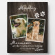Placa conmemorativa para mascotas de estilo campestre con efecto de madera oscura y rústica en el fondo, la inicial y el nombre de tu perro, 2 fotos para reemplazar con las tuyas, huellas de patas con corazón, y una cita de condolencias que dice 'los recuerdos son la forma en que el corazón se aferra a aquellos que amamos'.