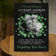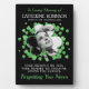 Placa conmemorativa temática irlandesa con una foto de su ser querido fallecido en forma de trébol, una dispersión de tréboles verdes, el texto "en memoria amorosa", su nombre, fechas de nacimiento y muerte, y el dicho conmemorativo "tu presencia extrañamos, tu memoria atesoramos, amándote siempre, olvidándote nunca"