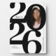 Placa de foto de graduación elegante que incluye una imagen del graduado, el año de graduación '2025' en una tipografía serif negra y negrita, su nombre y la escuela o universidad de la que se graduó.