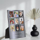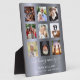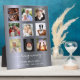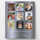 Crea tu propio fotomontaje único. Utiliza cuatro, 9 de tus fotos favoritas. Con el texto: en memoria amorosa. Personaliza y agrega un nombre y fechas. Un fondo con apariencia metálica plateada falsa, texto blanco.
