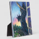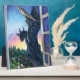 El Gargoyle Guardian Art de Traci Van Wagoner impresiones, posters, accesorios y regalos presenta un estilo de gárgola de piedra azul y gris mirando hacia atrás desde su posición en lo alto de la ciudad a primera hora de la mañana con un texturado cielo de amanecer de amarillo, naranja, rosa, violeta y azul. Consíguete hoy mismo a un guardián de la gárgola para que te tenga cuidado.