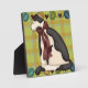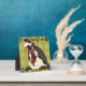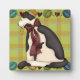Fondo verde, azul, dorado con un gato folclórico primitivo ilustrado en blanco y negro recortado con bolas de hilados y corazones. Regalos decorativos y útiles para ella. Ilustracion de guarnecido de gato e hilado por Trina Clark. Diseño de Deborah Miller.