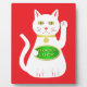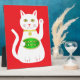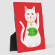 Esta impresionante placa muestra una imagen de diseño gráfico de un afortunado gato oriental blanco ondulado. El gato tiene hermosos ojos de oro y lleva puesto un medallón de oro en el cuello. El gato tiene orejas y bigotes rosas. Este lindo gatito sostiene una ficha de oro con entrada de jade verde y un mensaje en texto dorado que dice "Buena suerte".