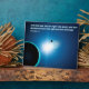 Una imagen estilizada en tonos azules y blanco de la Tierra y la Luna retroiluminada por el sol. Una traducción al inglés del Génesis 1:4 que decía "Dios vio que la luz era buena, y Dios dividió la luz de la oscuridad" también aparece en azul brillante y blanco.