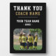 placa fotográfica de agradecimiento al entrenador Team Name. Personalice con su nombre de entrenador, nombre del equipo, foto del equipo y año. Puede cambiar cualquier texto de la placa. ¡Un gran regalo y una placa de bigote para un entrenador de fútbol!
