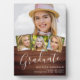 Celebre su graduación y dé un regalo especial personalizado con esta placa de graduación de collage de fotos personalizados en un diseño rústico de madera de campo. Esta placa única para graduados de collage de fotos será un tesoro. Personalizar con 4 de tus fotos favoritas de la universidad o de la universidad, y personaliza con el año de graduación, el nombre, la escuela secundaria o la universidad. Vea 'personalizar esta plantilla' para cambiar fotos y personalización. DERECHOS RESERVADOS © 2020 Judy Burrows, Black Dog Art - Todos los derechos reservados. Graduación Rústica 4 Foto Placa de graduado de madera con estilo