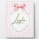 Agrega un toque de dulzura y elegancia al cuarto de tu pequeño con esta impresión personalizada para la habitación de una bebé. Con un fondo de gingham rosa suave, un delicado lazo de cinta y un nombre personalizable en una fuente de letra cursiva encantadora, esta obra de arte es el toque final perfecto para cualquier habitación, sala de juegos o dormitorio.