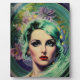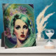 Echa un vistazo a este elegante y hermoso retrato de una mujer espacial con el universo como telón de fondo y un bonito halo verde alrededor de su cabeza adornado con flores de lavanda con un estilo retro de acuarela. ¡Hace un regalo perfecto!