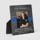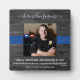 ¡Los héroes viven para siempre! Honre a su querido oficial de policía con esta placa conmemorativa de la delgada línea azul de la policía. Personalice con la foto, nombre y número de placa de su oficial, y fechas. Perfecto para el memorial de un oficial de policía para la familia o los departamentos de policía para honrar a un oficial caído. Cita: "Nadie tiene mayor amor que este: dar la vida por sus amigos. Juan 15:13". Placa conmemorativa de la policía en memoria. DERECHOS DE AUTOR © 2020 Judy Burrows, Black Dog Art - Todos los derechos reservados. Placa conmemorativa de la policía para oficial caído ¡Los héroes viven para siempre!