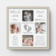 Crea un toque de natalidad que sea tan único como tu precioso hijo con este diseño de cuatro fotos de "Hola Pequeña" con el nombre de tu bebé, estadísticas de nacimiento, padres y nombres de hermanos. En el centro hay dos líneas de plantilla para tu mensaje personal o puedes usar el nuestro. Este mensaje está en la parte superior e inferior de las huellas opcionales de su hijo. Todos los colores de texto y fondo se pueden modificar según se desee. Se muestra aquí en gris y blanco. Diseño por diseños de corazones de vacaciones (derechos reservados) con fotos de marcadores de posición de plantilla mediante Unsplash.