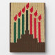 La imagen impresa en una placa independiente es de una foto de una pared de crochet de tapicería original colgada diseñada a mano y derechos reservados © por el diseñador publicado Delores Chamblin. En la placa se reproduce la imagen de la singular creación artesanal con velas Kwanzaa rojas, negras y verdes, en kinara marrón de madera.