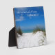Bring peace and inspiration into any space with this beautifully designed 5.25” x 5.25” tabletop plaque. Featuring a serene coastal scene, the image captures a white sandy beach with two gentle sand dunes topped with soft sea grass. Beyond, the calm blue ocean stretches beneath a bright, sunlit sky filled with soft clouds, creating a tranquil and uplifting atmosphere.