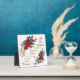 Esta placa superior de la mesa de vacaciones de bonito presenta una imagen de un ramo de poinsettia de color rojo y verde festivo en la parte superior izquierda, y otra imagen en la parte inferior derecha. En el centro hay palabras que están asociadas con Navidades, incluyendo alegría, amor, paz, risas, regalos, música, familia, amigos, felicidad y niños. El texto está en rojo, verde y dorado a juego. Todo está colocado sobre un fondo blanco.