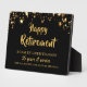 Crear una placa conmemorativa personalizada para el premio keepsake para el retiro y reconocer a un jubilado. El diseño de estrellas de color negro y oro con HAPPY RETIREMENT en la tipografía de escritura de pincel con letras modernas y personalizadas con el nombre del jubilado, años de servicio y nombre de organización u otro texto personalizado. Póngase en contacto con el diseñador a través de Zazzle Chat o makeitaboutyoustore@gmail.com si desea modificar este diseño, en otro producto o si desea coordinar elementos.