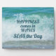 Esta hermosa placa de playa es un recordatorio inspirador de que "La felicidad llega en los Mares de Olas el Día". Una ola oceánica se está rompiendo y salpicando en un mar tropical de agua azul acuática. Una motivación "Aprovecha el Día", pero con una vida de playa. Fotografía del paisaje marino original por JLW_PHOTOGRAPHY
