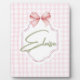 Agrega un toque de dulzura y elegancia al cuarto de tu pequeño con este cuadro personalizado para la habitación de una bebé. Con un fondo de gingham rosa suave, un delicado lazo de cinta y un nombre personalizable en una fuente de escritura encantadora, esta obra de arte es el toque final perfecto para cualquier habitación, sala de juegos o dormitorio.