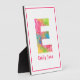 Una placa decorativa para la guardería o habitación de los niños con la letra E pintada con salpicaduras de colores y texto rosa personalizable, enmarcada con un borde rosa fino.