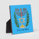Esta imagen fue adaptada de una antigua teja judía persa y cuenta con una menorah con un Magen David (Estrella de David) enmarcado por ramas de olivo. Se han conservado las imperfecciones de la imagen original pintada a mano. Agregue su propio texto y puede cambiar el color de fondo.
