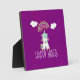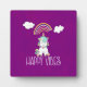 Una placa fotográfica con un adorable dibujo de un asombroso unicornio sentado en su trasero tranquilo y feliz. Unas nubes esponjosas y un arcoiris colorido encima. El texto dice: Feliz Vibes. Increíble positividad. Está situado sobre un fondo de color morado rosado.
