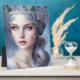 Reina de bonito de invierno con una corona de plata adornada en el cabello de plata - una placa artística de tabletas de festividad fantasmal creada con software de representación de IA.