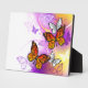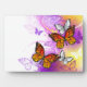 Naranja, mariposas monarcas detalladas sobre la luz, púrpura, pintoresco fondo pintado.
