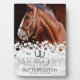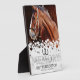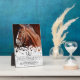 Placa fotográfica de caballos personalizada con un fondo moderno de mármol con motivos cardíacos, una foto atesorada de tu querido caballo, herraduras, el dicho "en la memoria amorosa", el nombre de tus mascotas y fechas.