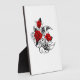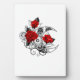 Contorno, luna de media luna mecánica con engranajes, decorada con rosas rojas con tallo negro y hojas sobre fondo blanco. Steampunk