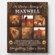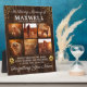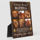 Placa personalizada con foto de perro con fondo de madera rústica, 6 imágenes preciosas de tu querido animal, huellas de patas doradas y purpurina, el texto "en memoria de", el nombre de tu perro, fechas de nacimiento y fallecimiento, y la cita de condolencias "tu presencia nos hace falta, tu recuerdo atesoramos, te queremos siempre, nunca te olvidamos"