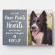 Placa conmemorativa de mascota personalizada con una foto de tu querida mascota, un fondo de pizarra gris falso rústico y una cita de condolencias que dice "dejaste huellas de patas en nuestros corazones y hemos cambiado para siempre", una huella de pata, corazón, el nombre de tu perro y las fechas. Un hermoso recuerdo y tributo a tu preciosa mascota familiar perro o gato.