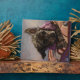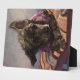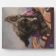 Mezcla adorable y pequeña mezcla de caniche pintada por Traci Van Wagoner poniendo un bronceado y una almohada roja con una oreja encaramada en la cabeza.