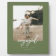 Modern Olive Green "Engaged" Script Photo Plaque. Personalize this elegant and minimalistic couple photo plaque with your names, engagement date, and a favorite engagement photo.