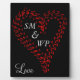 Gran corazón rojo formado por notas musicales en el centro contra un fondo negro. Las iniciales monogramadas de la pareja están escritas dentro del corazón romántico en texto gris plateado. El amor está escrito bajo el corazón en escritura bonito. Buena idea de regalo para tu novia. Diseño original de obras de arte de TamiraZDesigns.