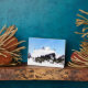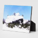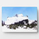 Una pintura de una cima de montaña cubierta de nieve que es el cuerpo de tres cabras jóvenes de montaña. Esta escena montañosa de invierno cuenta con pequeños grupos de pinos y un hermoso cielo azul. Pintura ©2017 Kimberly J Tilley.