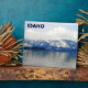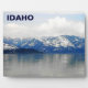 Una pintura digital de montañas nevadas en las orillas del lago Pend Oreille (camino de estanque) en Sandpoint, Idaho en un día de invierno tardío. También aparece un texto de personalizable que dice "IDAHO".