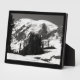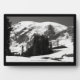 Fotografía en blanco y negro del Monte Rainier cubierta de nieve. Hay piedra a la vista. El hielo y la nieve del volcán se están derritiendo. Algunos árboles atraviesan el paisaje accidentado. Derechos reservados ©2023 Kimberly J Tilley. zazzle.com/store/developingnature
