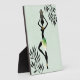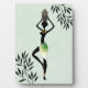 Placa de pie inspirada en el arte africano, hecha con un papel de color verde claro con un fondo de fondo. Una silueta negra de una mujer africana con una jarra en la cabeza decora el centro del lienzo y siluetas negras de ramas con hojas, en dos esquinas.
