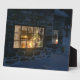 Mirando en las ventanas de la cabaña en una helada noche de invierno justo antes de los Navidades. Las velas rojas brillantes están encendidas, lo que envía un cálido resplandor sobre la nieve. El árbol de Navidad y el manto están decorados con púrpura y bolas de oro. Un gato calico mira por la ventana a una garganta sentada en el exterior del alféizar, y un par de zorros se asoma a la esquina de la casita.