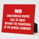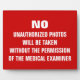 Señal roja con texto personalizado blanco para las salas de autopsia. Tomar fotos sin permiso está prohibido.