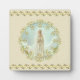 Una hermosa imagen de Nuestra Señora de Fátima con fondo de encaje beige, borde circular de encaje dorado y eslabón de cadena de diamante dorado por encima y por debajo.